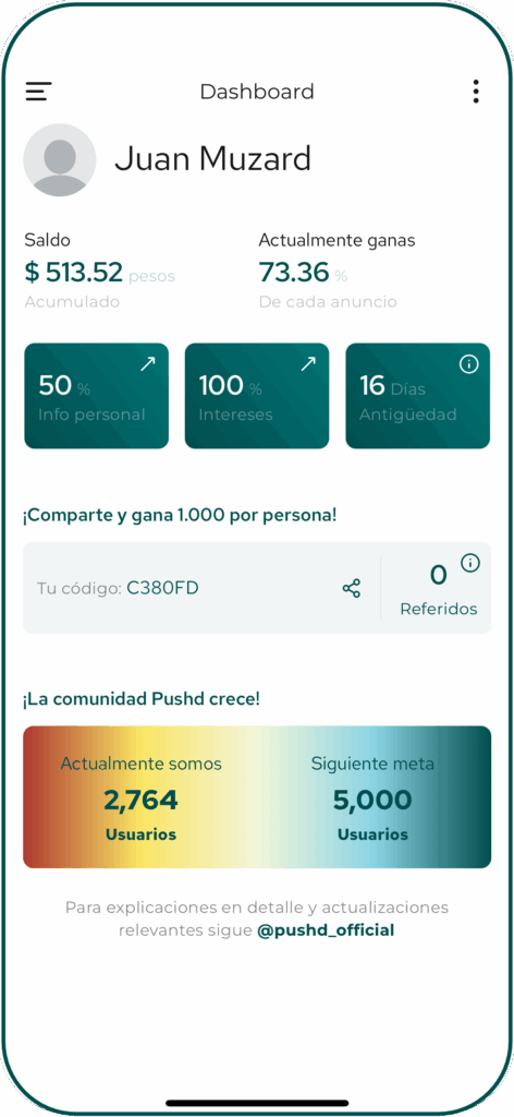 Comparte tu código único de referidos y aumenta tu cuenta de usuarios ganados. Entre más tengas, más incrementarás el porcentaje que ganas. Adicionalmente, Pushd recompensa a los usuarios por el tiempo que han sido parte de la app y cantidad de días seguidos conectado también incrementa tu porcentaje.